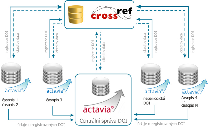 Velké organizace mohou pod jednou registrací na CrossRefu přidělovat DOI z více pracovišť – typicky několik redakcí časopisů plus registrace neperiodických DOI, může jít i o více nezávislých instalací Actavie. Díky modulu Centrální správa DOI můžeme sledovat všechny přidělené DOI z jednoho místa.